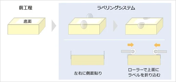 - 2台のラベル貼付装置で箱の両側面にラベルを貼付し、ローラーでラベルを折り込むラベリングシステムをご提案。