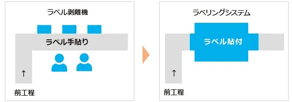 - 他工程のほとんどが自動化されているので、ラベル貼り工程も機械化したいと考えているが、 現場のスペースが限られており、大きな装置を入れることは難しい。ラベル貼り自動化は可能だろうか?